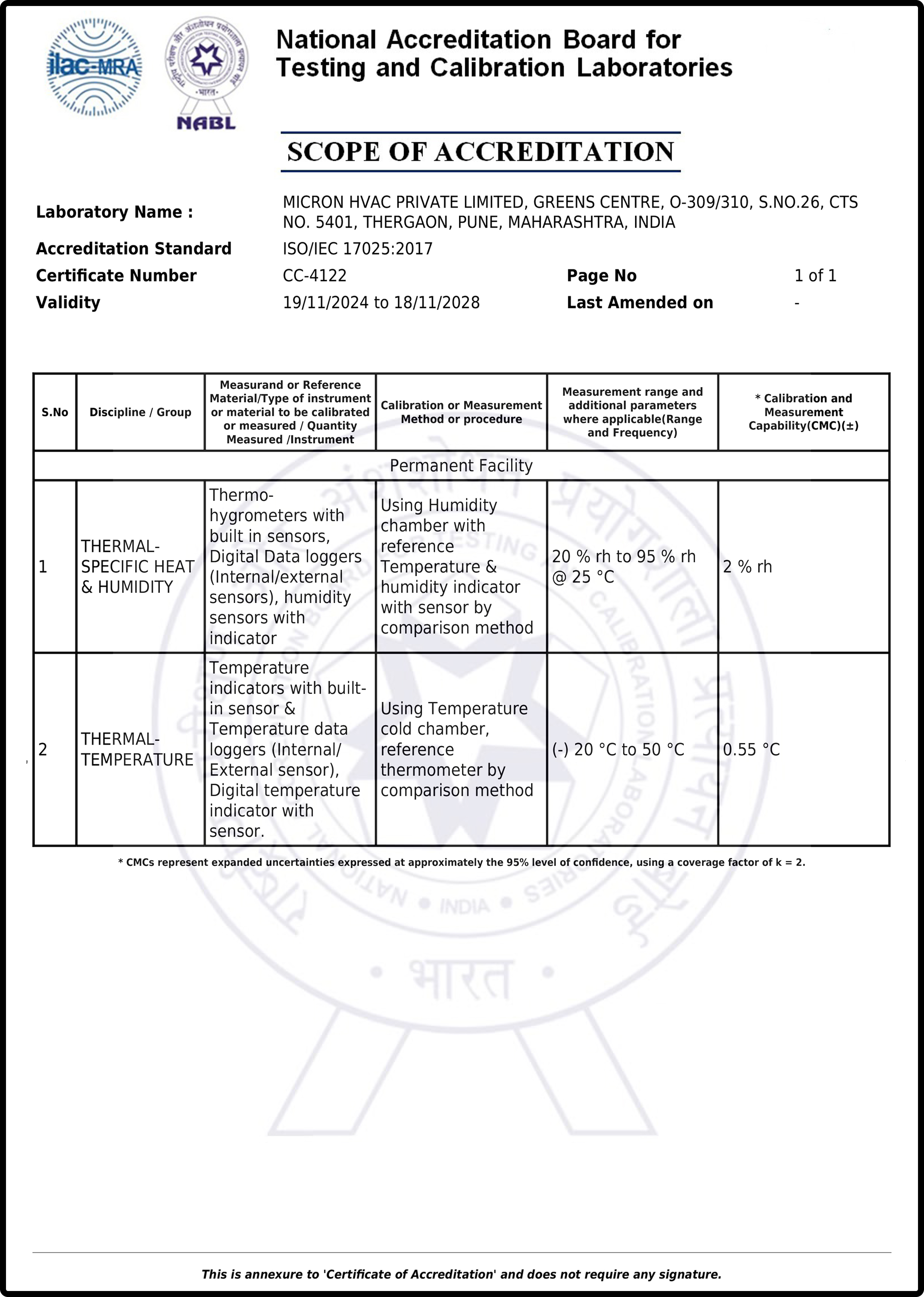 Micron HVAC Pvt. Ltd. meets the rigorous qualifications for National Accreditation Board for testing and calibration laboratories (NABL) accreditations as per ISO/IEC 17025. Our current NABL scope can be viewed at www.nabl-india.org